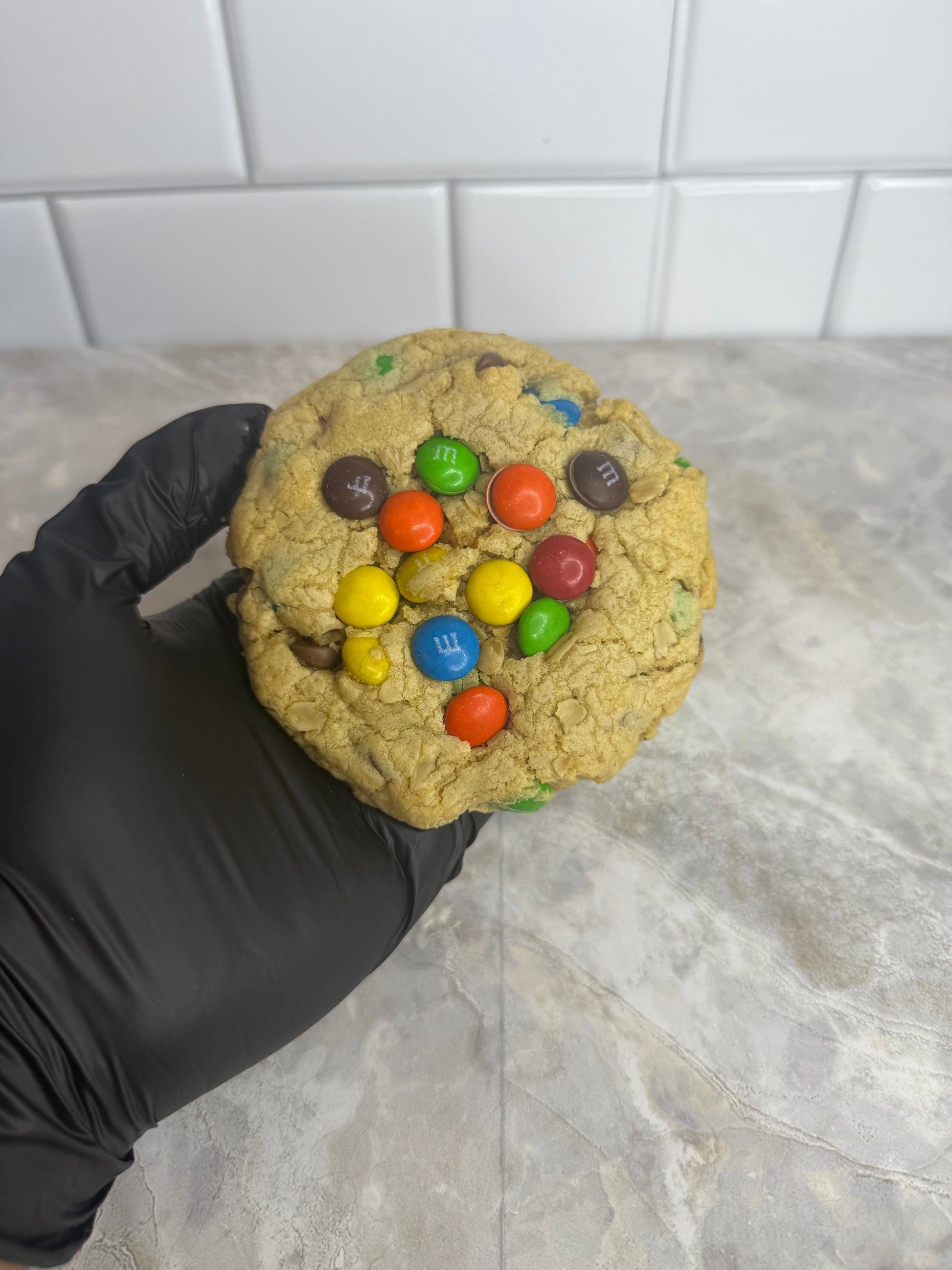 Enjoy our Monster Cookies! Now these cookies are the cookies you had in high school during cooking class! They are filled with M&Ms, Chocolate Chips, and Oatmeal, with just a little bit of peanut butter in the batter!